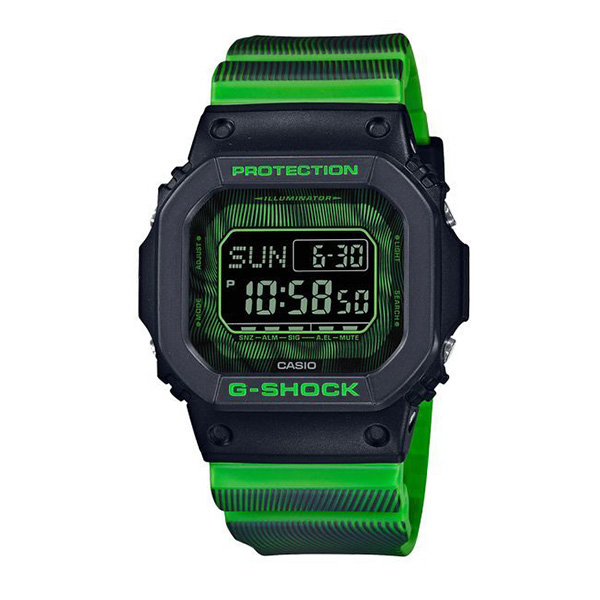 Casio G-Shock DW-D5600TD-3 iz Time Distortion serije kombinuje prepoznatljivu otpornost G-Shock modela sa maskirnim dizajnom i zelenim akcentima. Ovaj digitalni sat je vodootporan do 200 metara, otporan na udarce, i opremljen funkcijama poput štoperice, tajmera, višestrukih alarma, automatskog kalendara i LED osvetljenja sa automatskim senzorom, idealan za sportske i svakodnevne aktivnosti.Zemlja porekla (proizvodnje): Kina; Uvoznik: Sense doo